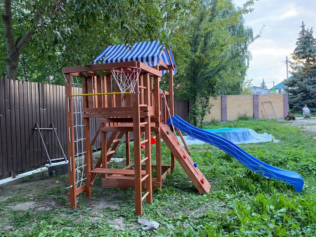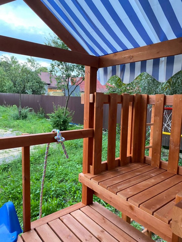Конструкция сертифицирована и безопасна. Крепежи скрыты под хорошо закрепленными заглушками – поэтому даже малыши не поранятся. Каркас состоит из натуральных деталей – клееного бруса квадратного сечения со стороной 75 мм. Во избежание получения заноз и ссадин дерево отшлифовано, а края скруглены.