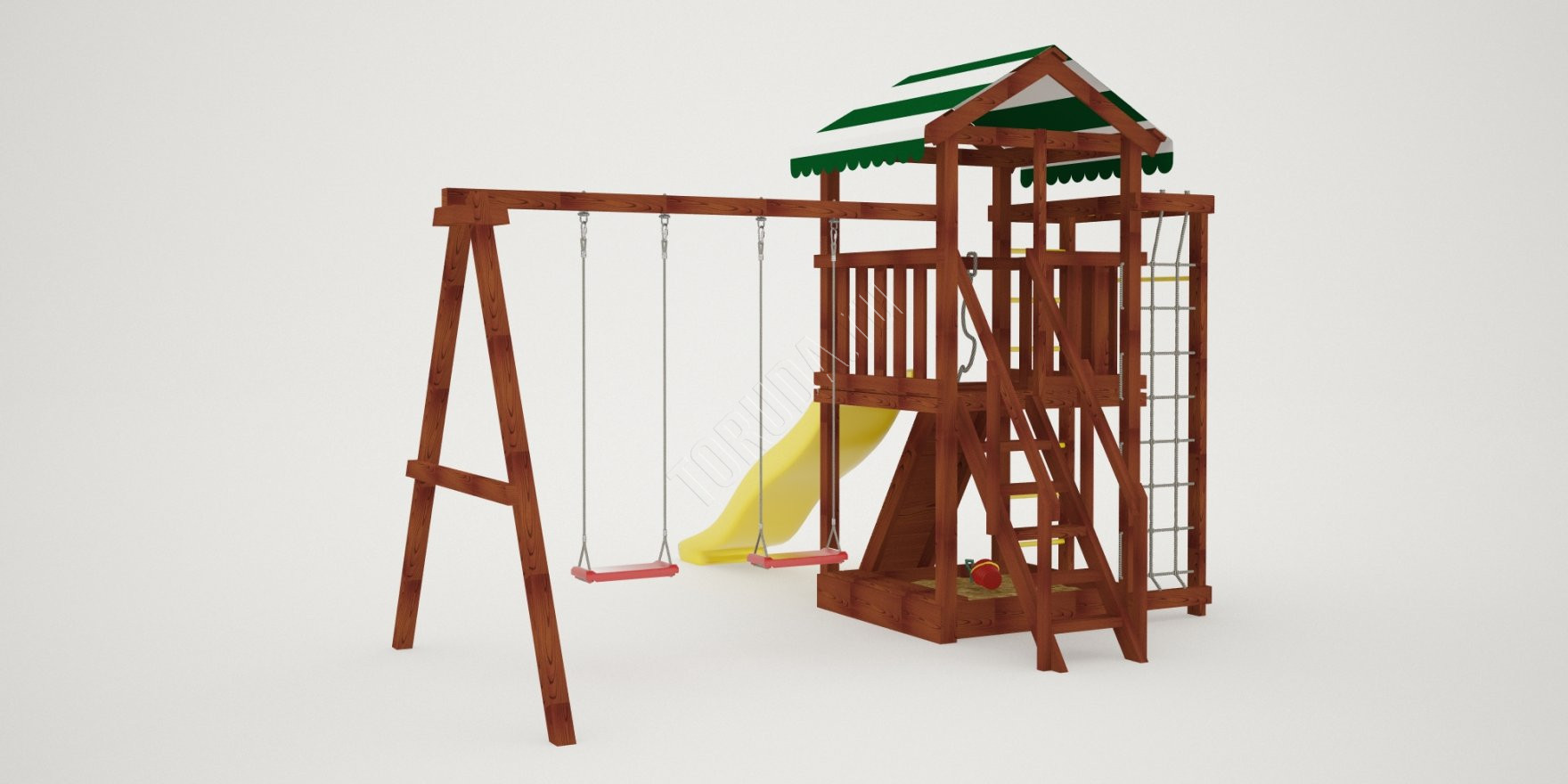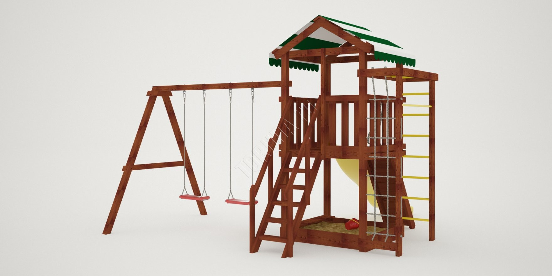 Конструкция, качество дерева и качельные подвесы соответствуют ГОСТ. Основной материал натуральный – это экологичный клееный брус, он гладкий на ощупь, его углы скруглены во избежание получения ссадин. Дерево обработано пропиткой. Площадка полностью безопасна: все крепежи и болты плотно закрыты заглушками, а спортивное оборудование используется от проверенного сертифицированного бельгийского производителя.