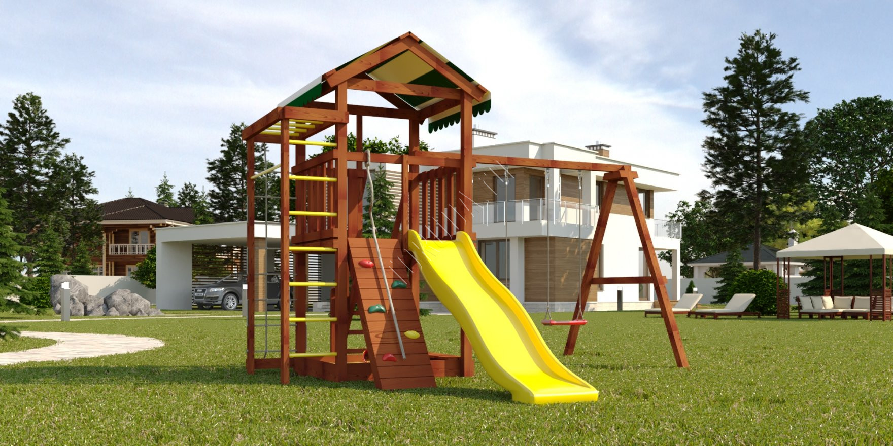 Альпинисты будут взбираться по скалодрому, использовать свисающий канат в помощь или нет, пусть выбирают сами, и наматывать круги по рукоходу. Моряки важно зайдут по лестнице с поручнями на самый верх башни и будут наблюдать за обстановкой в море, а потом молниеносно спустятся вниз с синей горки. Маугли или Тарзан ловко вскарабкаются по сетке-лазалке или шведской стенке, точно найдут клад в песочнице и поделят сокровища на лавочке рядом с ней. И что точно сделает каждый из героев – полетает на сказочных качелях, это одно из любимых детских развлечений.