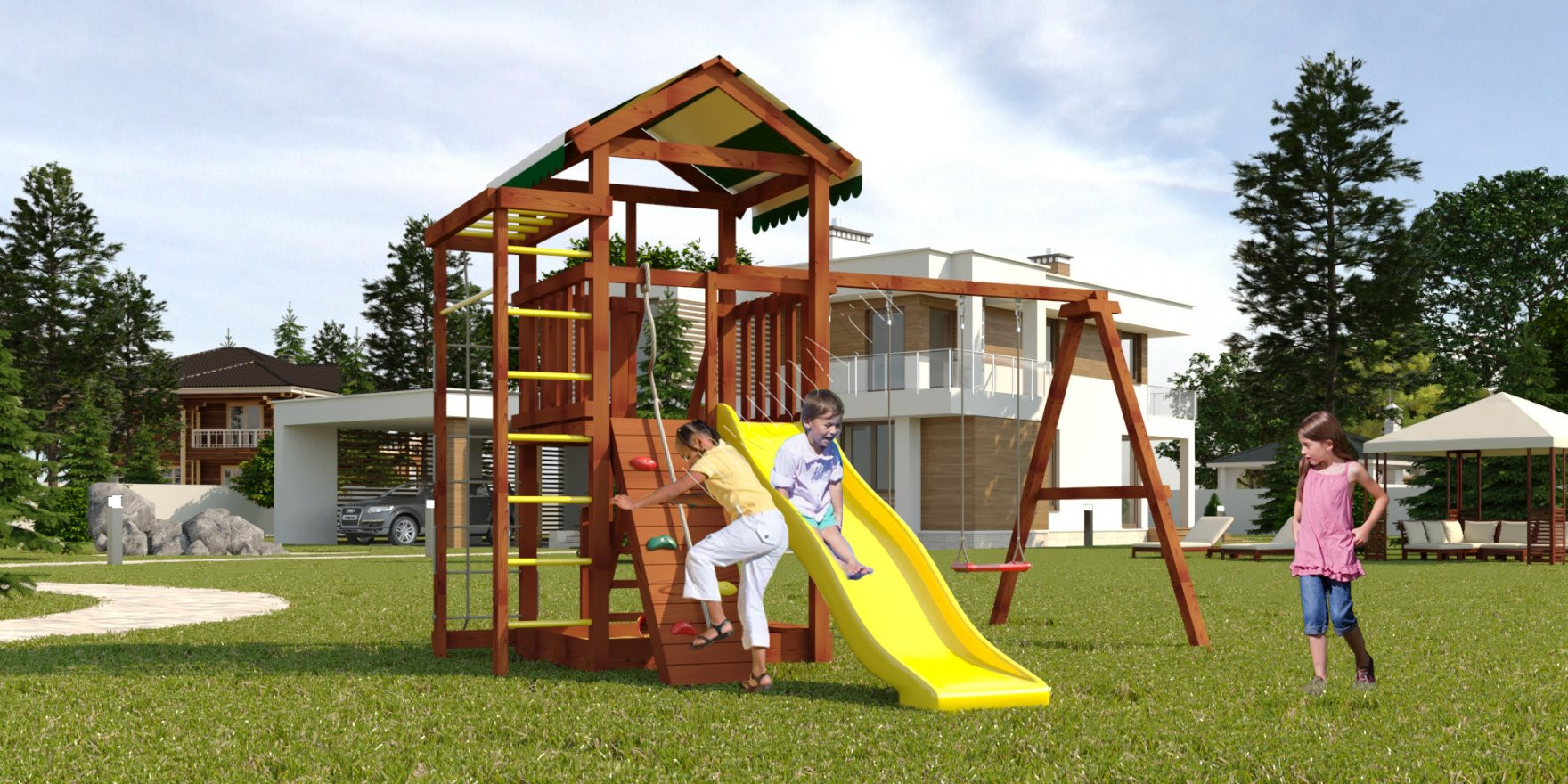 Современная игровая площадка универсальна во всех планах: подойдет для детей от трех лет, его можно расположить в любом удобном месте, выдерживает перепады температур и различные осадки.